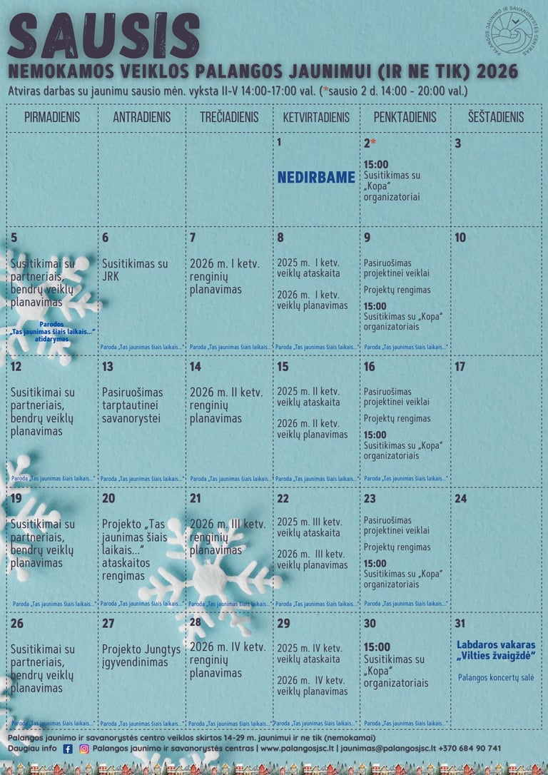 Mes jau po truputį ruošiamės kitiems metamsir dalinamės sausio mėn. veiklomis Palangos jaunimo ir savanorystės centre. Kadangi metų pradžia, visą mėn. dirbsime su projektais, metų veiklų pasiruošimu, susitikimai su parnteriais ir žinoma pasiruošimas Palangos jaunimo apdovanojimams „Kopa“ 2025